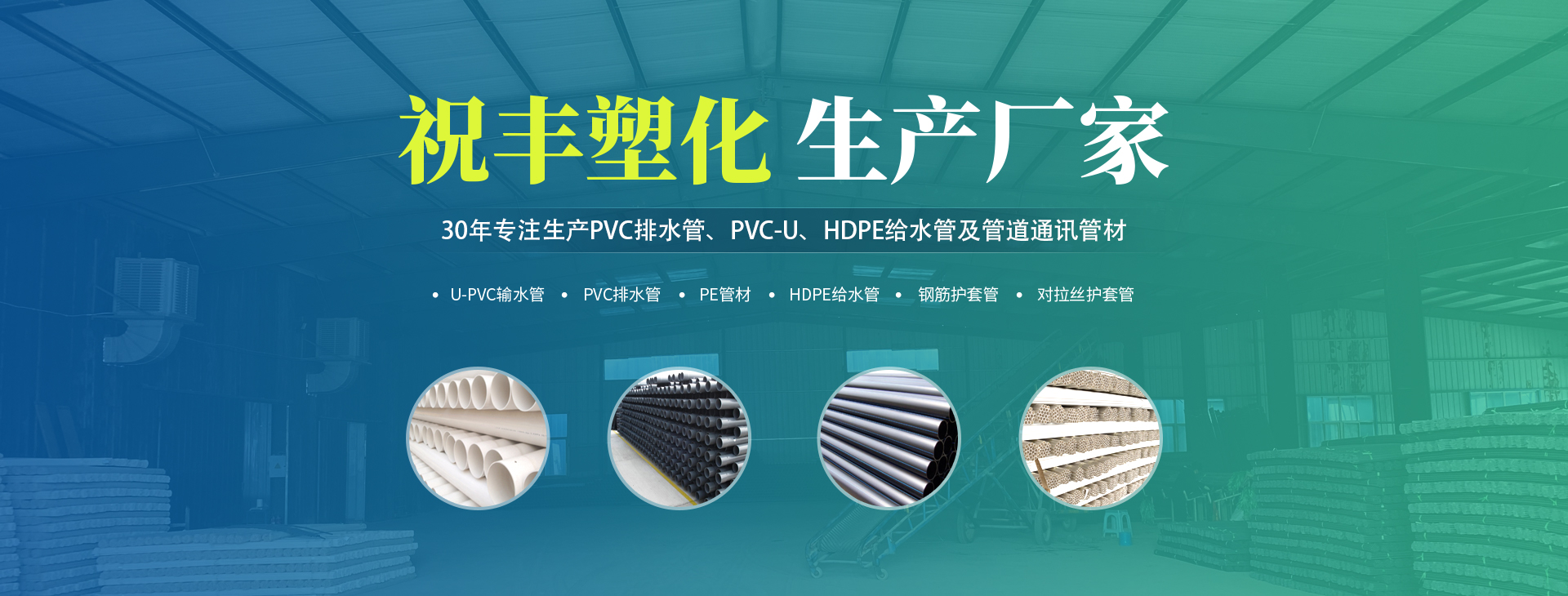 安陽(yáng)市祝豐塑化有限公司坐落在滑縣工業(yè)園區(qū),東臨大廣高速,西臨京珠高速,是鄭州、鶴壁、安陽(yáng)、濮陽(yáng)四個(gè)城市的輸紐,交通便利、環(huán)境優(yōu)美。       公司始建于八十年代,經(jīng)過(guò)二十余年的艱辛創(chuàng)業(yè),規(guī)模不斷壯大,由十多萬(wàn)元資產(chǎn)的小廠,發(fā)展到現(xiàn)占地面積達(dá)一萬(wàn)多平,建筑面積一萬(wàn)平,資產(chǎn)2000多萬(wàn)元管材生產(chǎn)企業(yè)。公司生產(chǎn)PVC-U、PVC排水管、HDPE給水管、鋼筋護(hù)套管管道通訊管材等產(chǎn)品,廣泛用于農(nóng)田節(jié)水、高山引水、人畜用水、建筑、電力通訊等多種用途,品種齊全。為了滿足用戶需求,可承攬各種給水、節(jié)水、灌溉工程。“祝豐塑化”憑借強(qiáng)勁的實(shí)力,優(yōu)良的管理水平?!耙再|(zhì)量求生存,以信譽(yù)求發(fā)展”的原則全力以赴和大家共同塑造美好未來(lái)。..